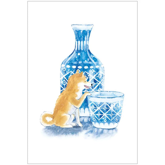 Postcard: 村田 夏佳 (Natsuka Murata): Shiba-Inu with Sake on an Edo-Kiriko bottle