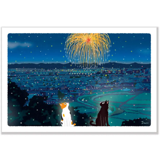 Postcard: もり としのり (Mori Toshinori): たびねこ (Tabi-Neko: Travelling Cat): Hanabi (Fireworks)
