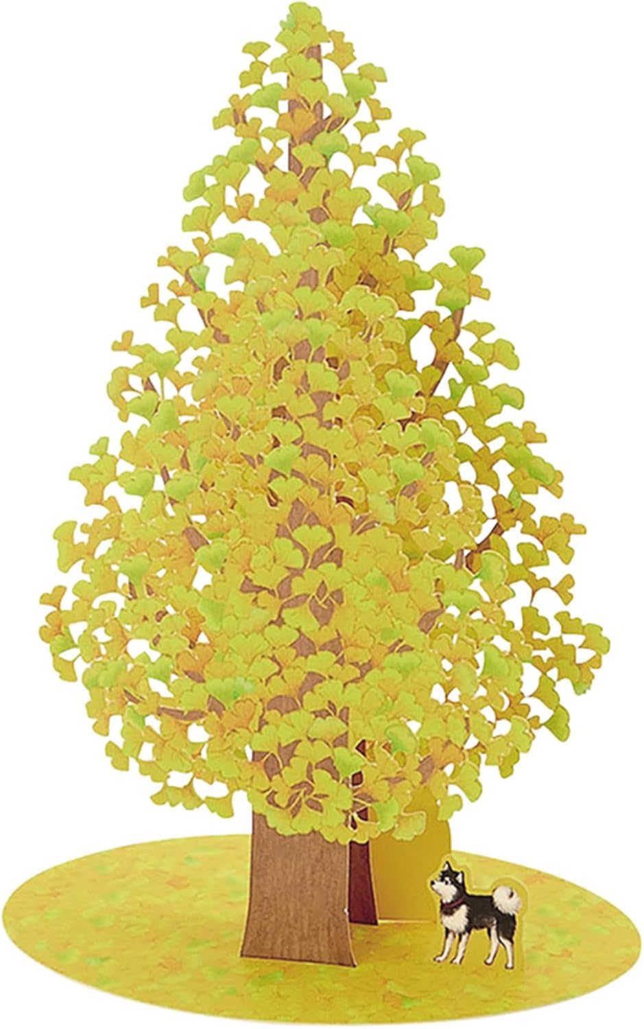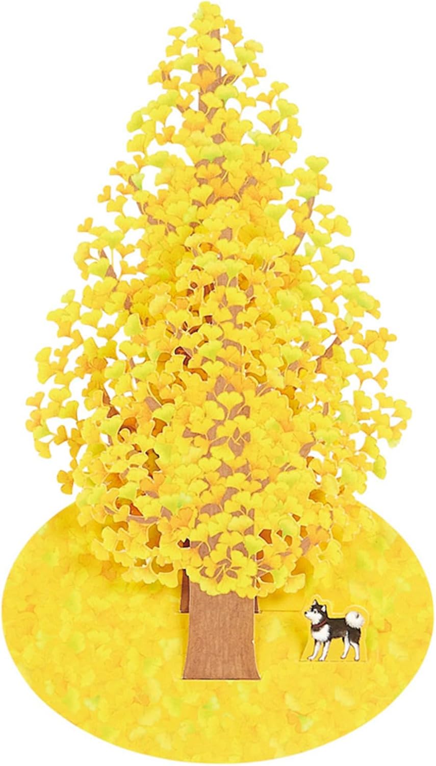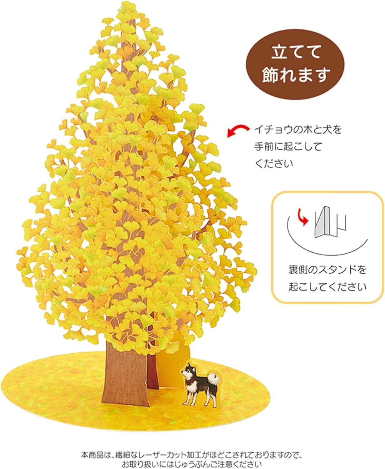 This autumn season card features a single yellow ginkgo tree, with delicate laser-cut gingko leaves that add an elegant touch. It can be displayed upright, making it a lovely decoration for the season, and includes a message space at the bottom as well as a matching ginkgo envelope.