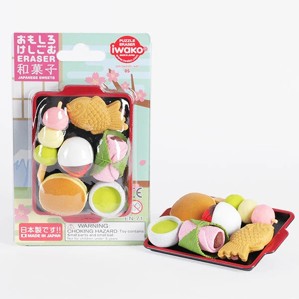 This set has 5 erasers in the shape of delicious Japanese traditional sweets and 1 eraser on the shape of a bowl of matcha tea. They come with a plastic tray where you can "serve" the sweets and tea.