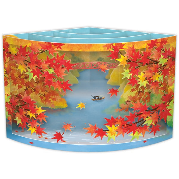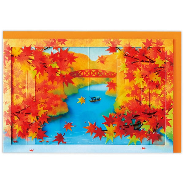 A beautiful autumn card with a bridge over a valley of autumn leaves and a boat on the river. The transparent material is layered to create depth in the scenery. It can be enjoyed not only as a card but also as an interior decoration.