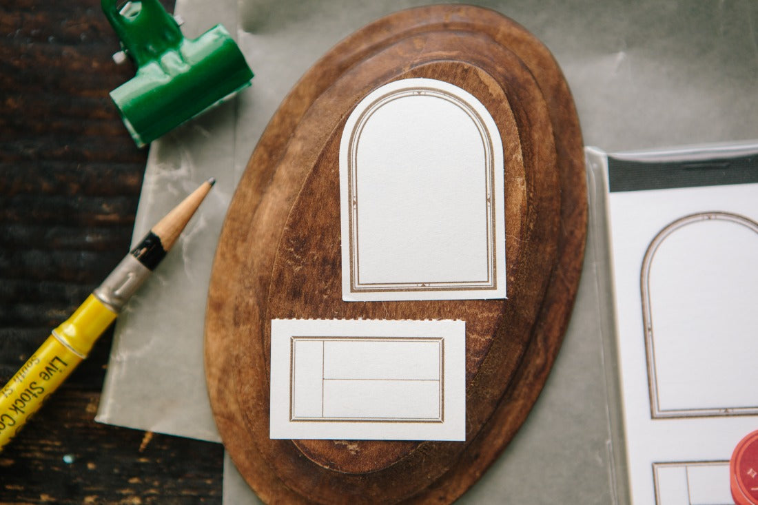 The "Window Label Letterpress Book" by OURS features a vintage-inspired design with arch-shaped windows and small square frames.
