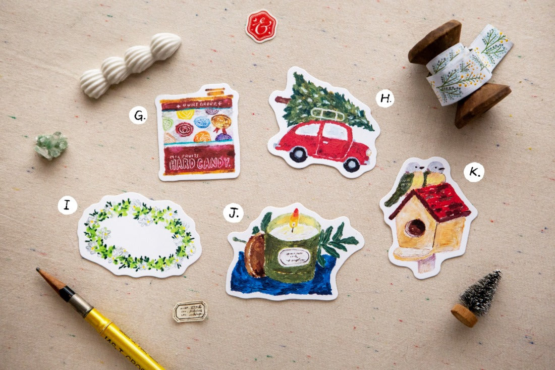 The collection features 15 unique designs, including delightful motifs such as apples, wreaths, omamori, candles, and birdhouses.