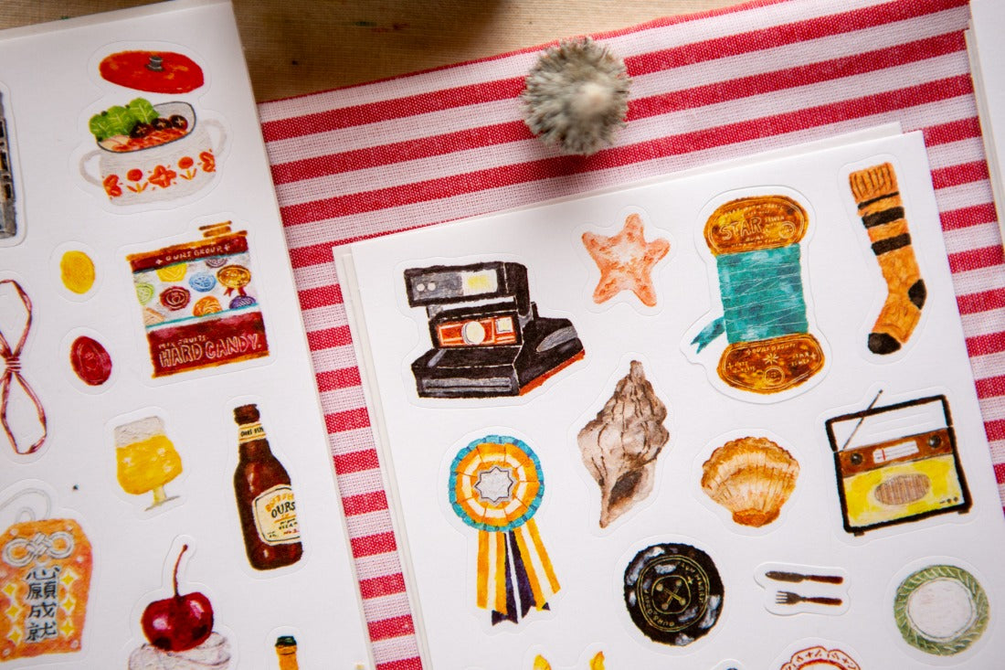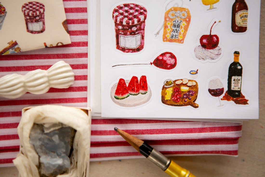 This sticker pack, designed by OURS, showcases charming illustrations inspired by life's delightful moments—a glass of wine, cheese platters, gift ribbons, and birthday cherries.