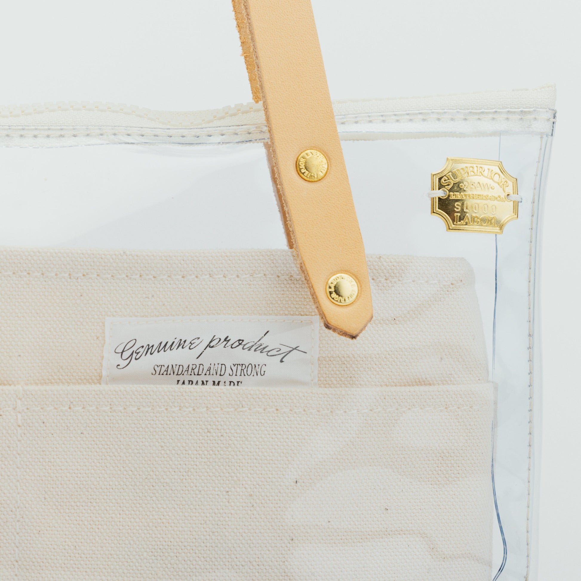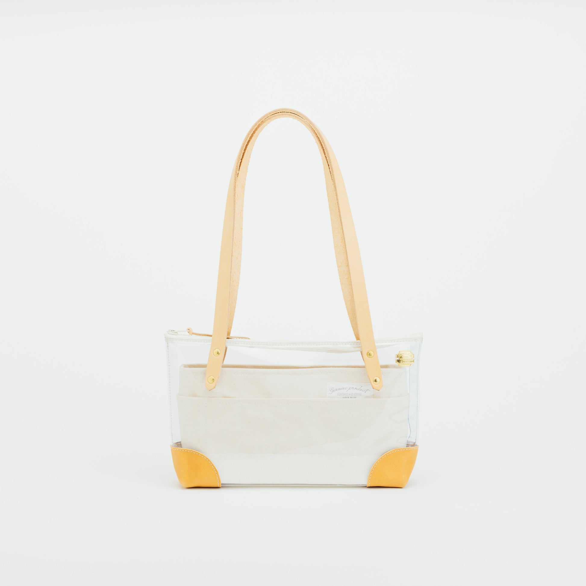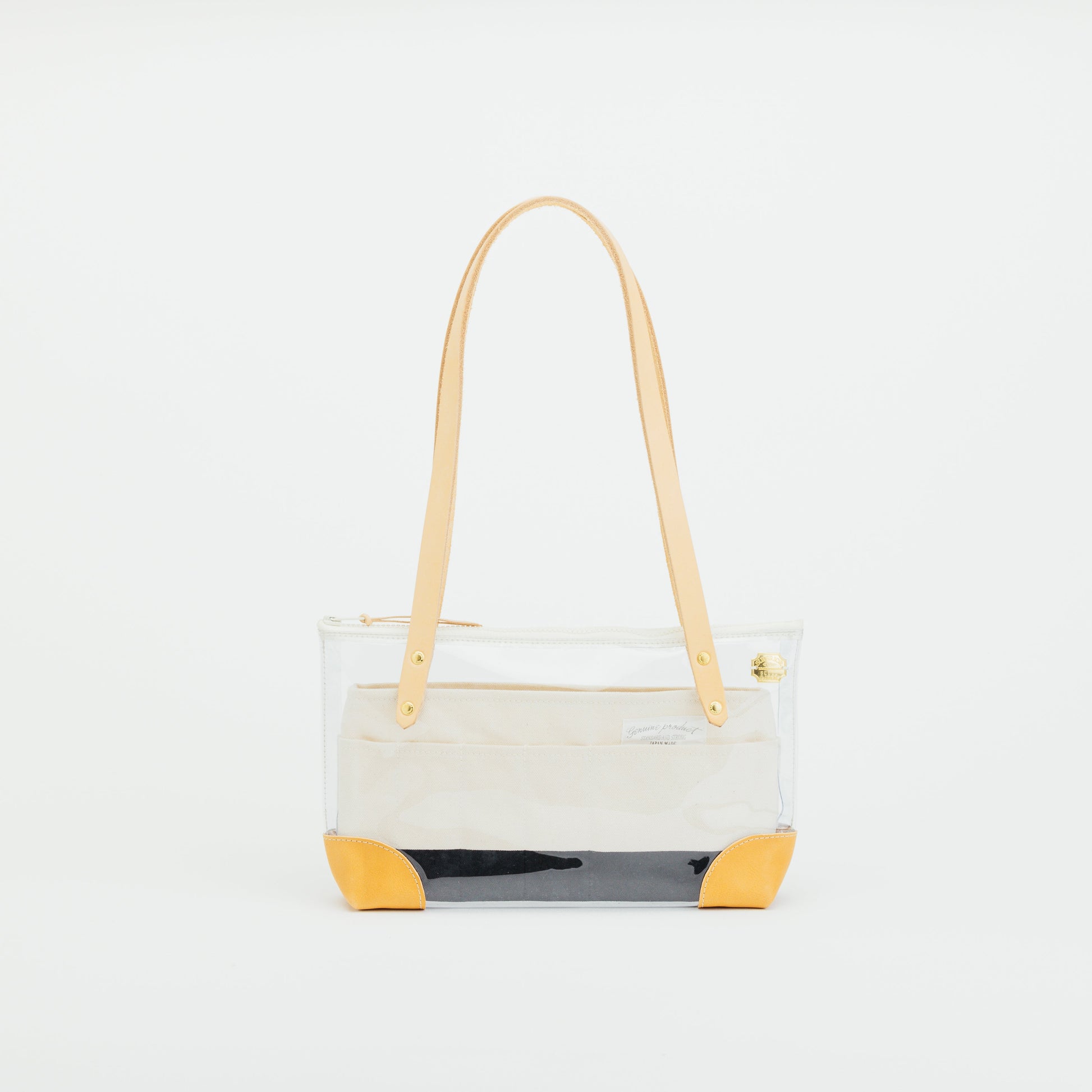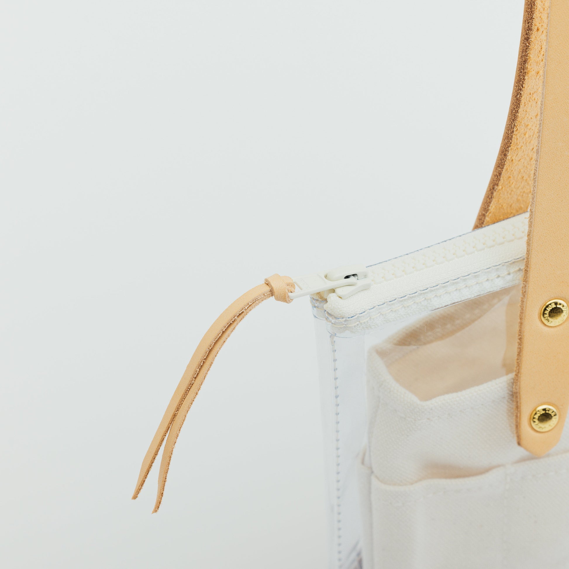 A light and practical shoulder bag made from transparent PVC, accented with leather handles and bottom corners. It comes with a removable canvas inner bag featuring tool pockets—perfect for keeping smaller items tucked away, or for organizing your essentials.