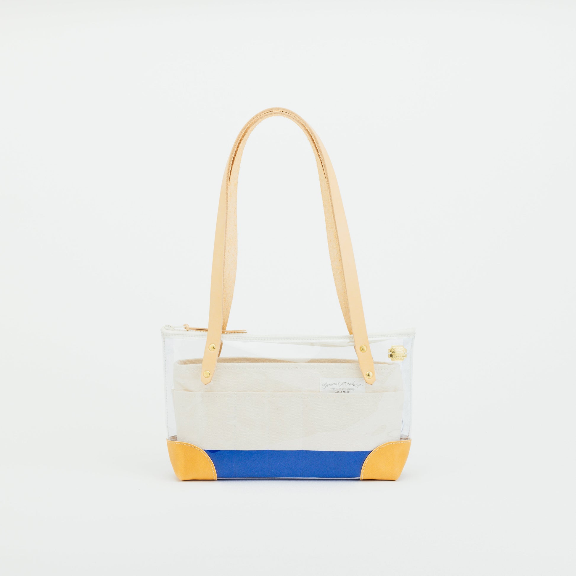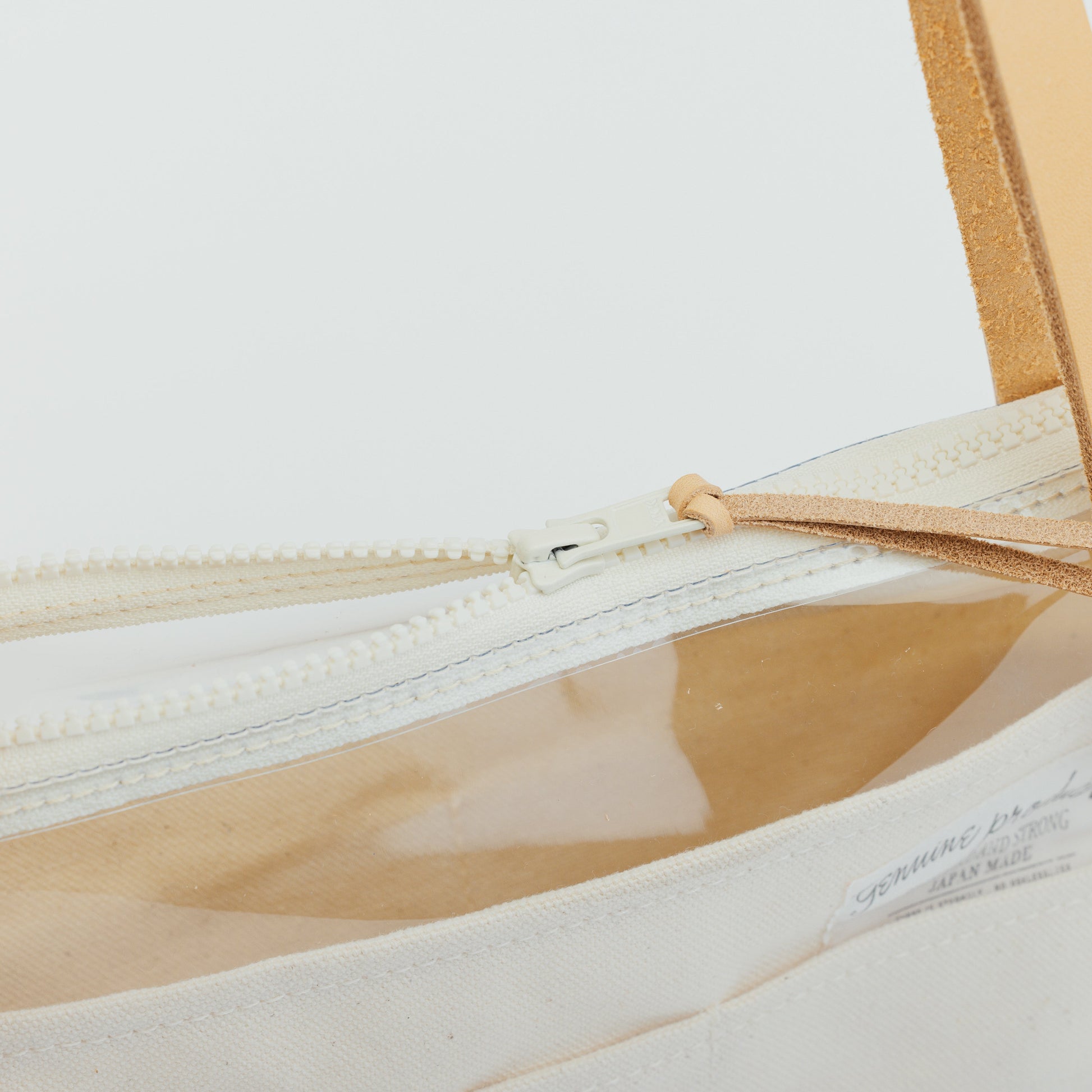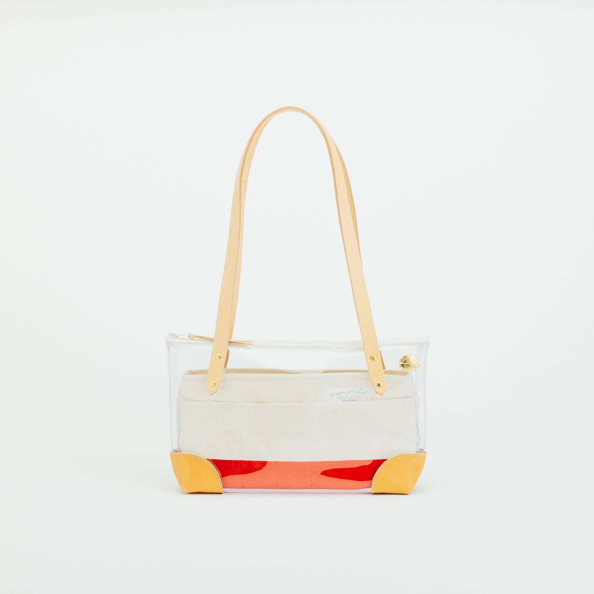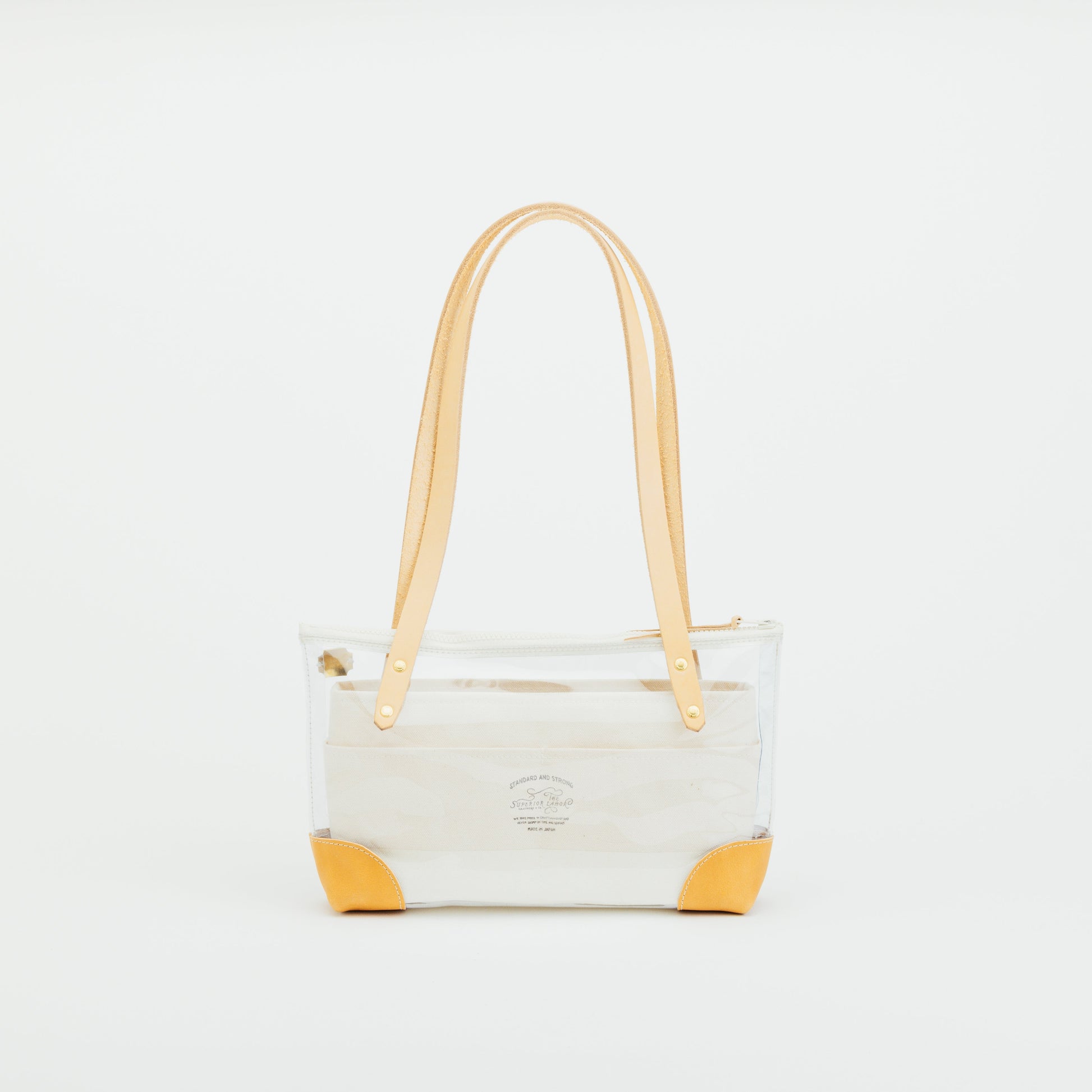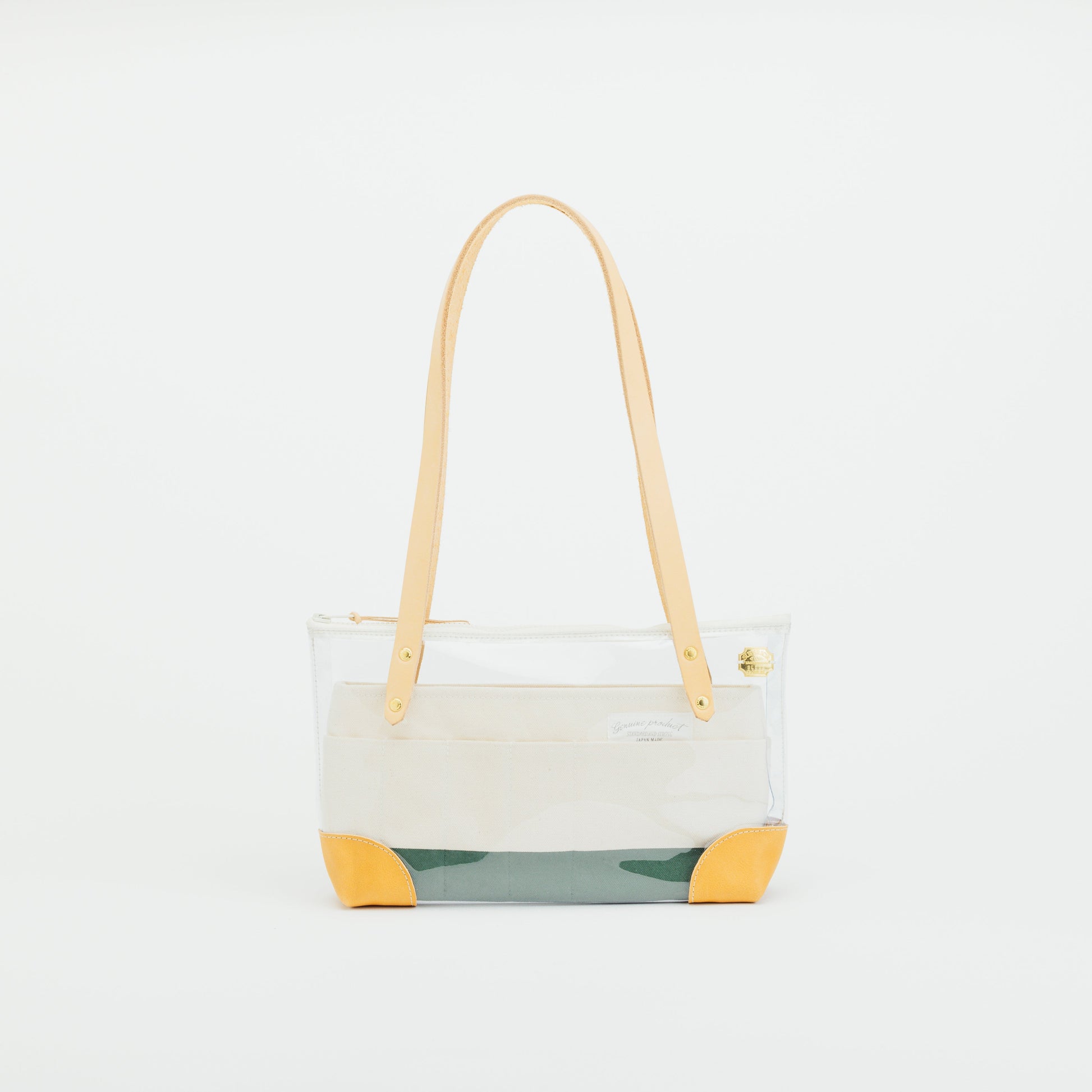 A light and practical shoulder bag made from transparent PVC, accented with leather handles and bottom corners. It comes with a removable canvas inner bag featuring tool pockets—perfect for keeping smaller items tucked away, or for organizing your essentials.