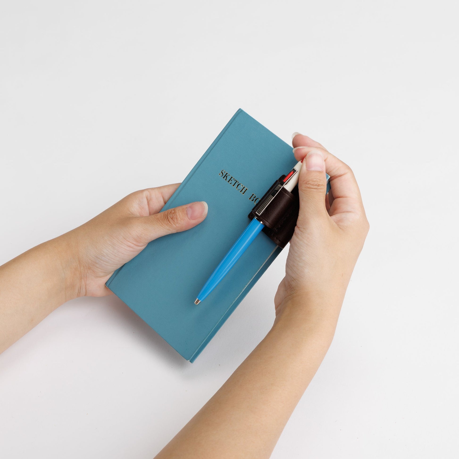 A handy leather pen holder with built-in magnets that clips onto your notebook or planner, so you can carry your pen right along with it.