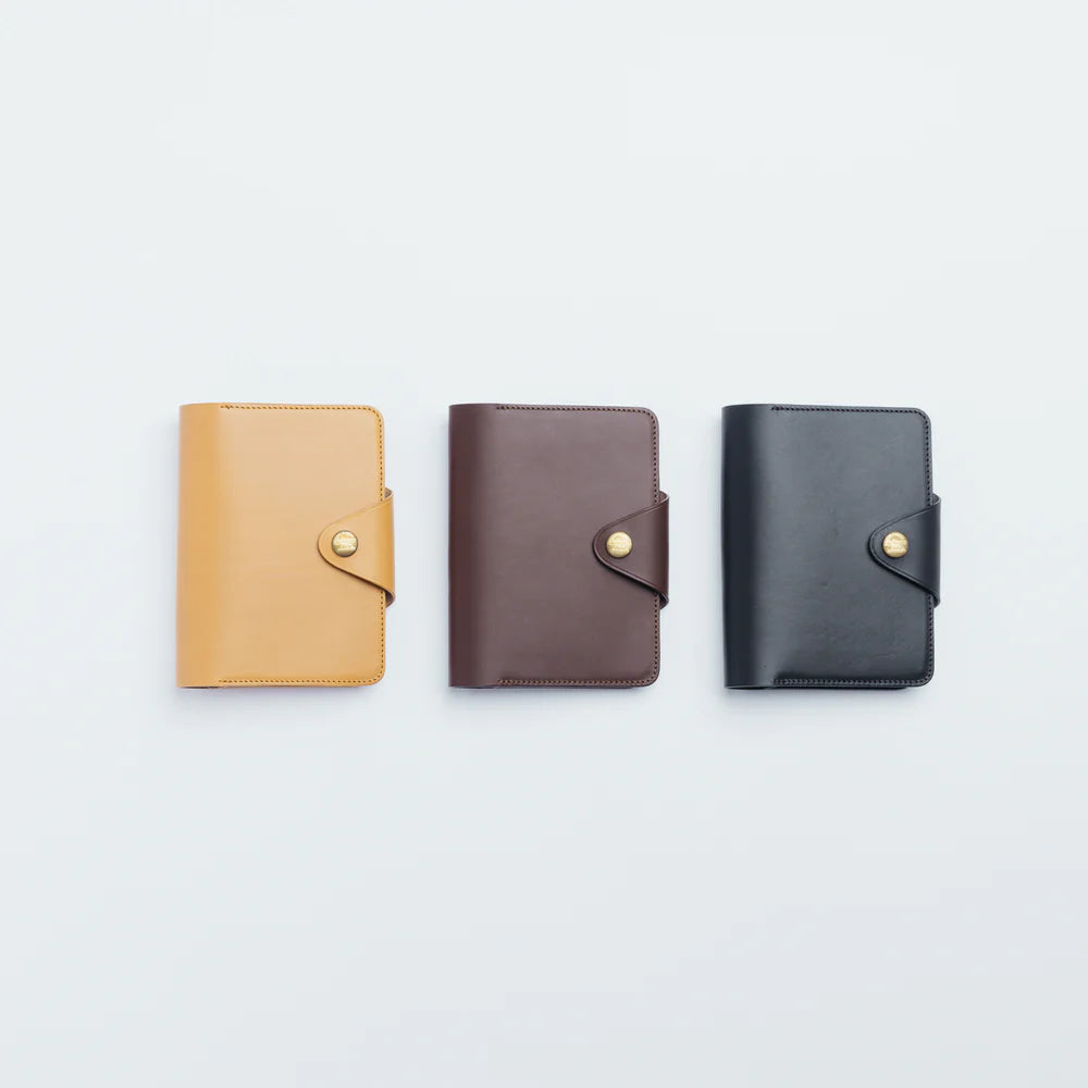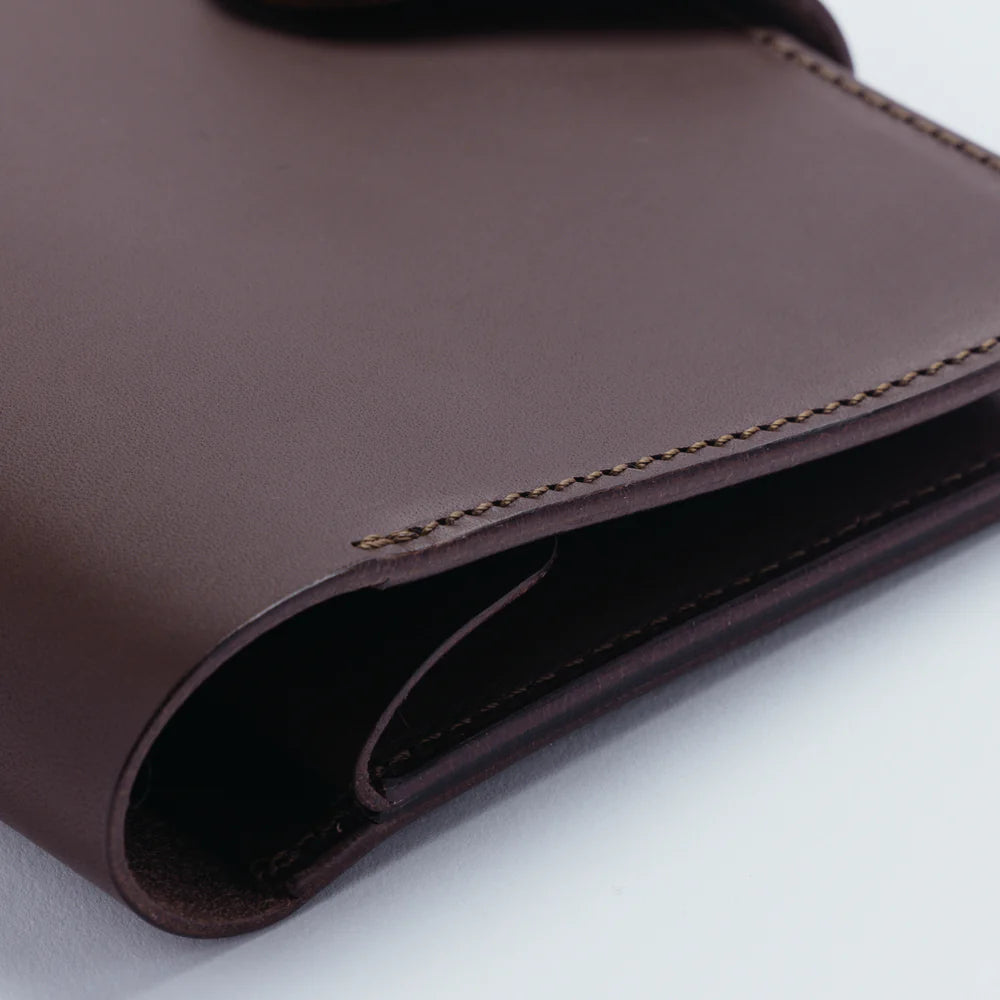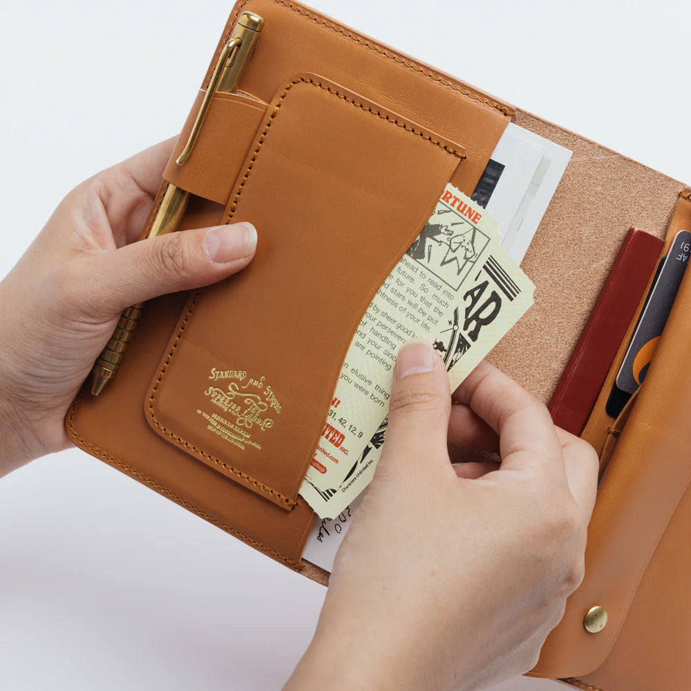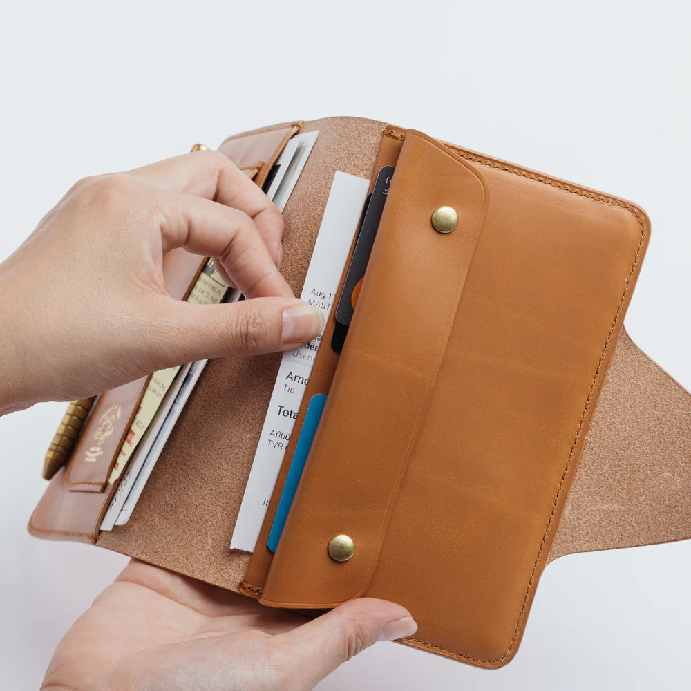 A handmade leather organizer. It can hold an A6 planner or a thick A6 notebook, like, for example, MD Notebook. It has multiple pockets including one with a flap that can be used as a wallet or pen case.