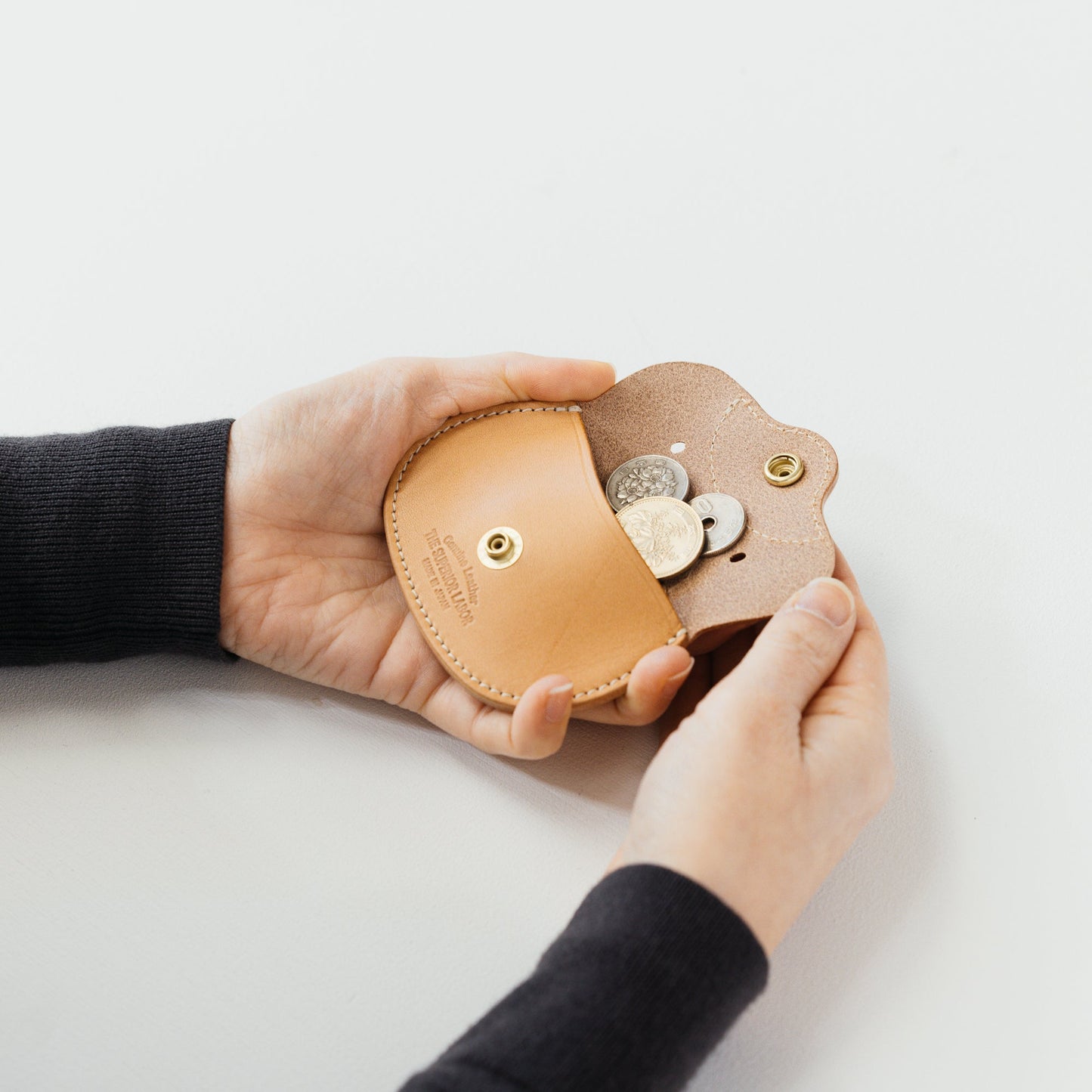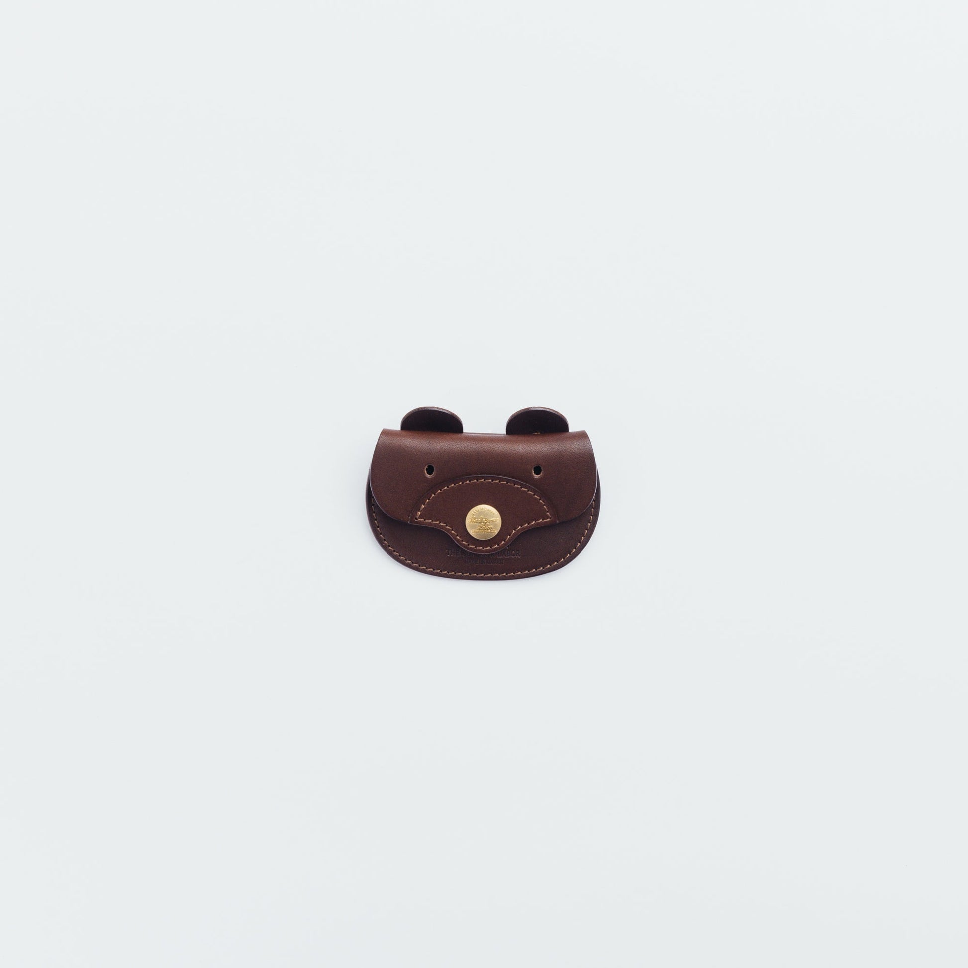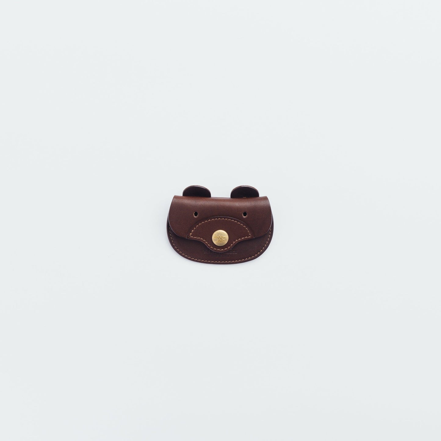 A handmade leather coin case with dog design. It has a key ring on the back, so it can be attached to a bag as a charm or used in combination with the HTS series of TSL.