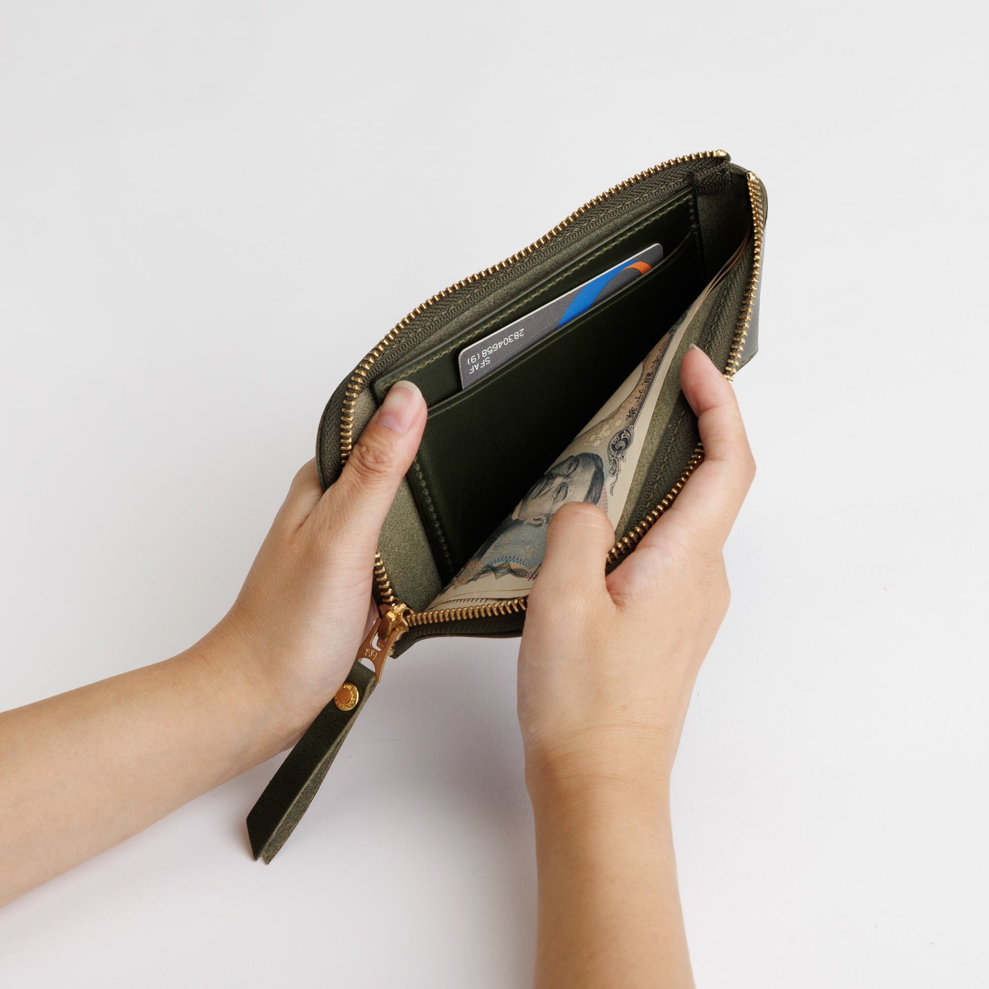 The larger “parent” wallet features an interior divider, allowing you to separate bills from tickets, receipts, or other paper items.