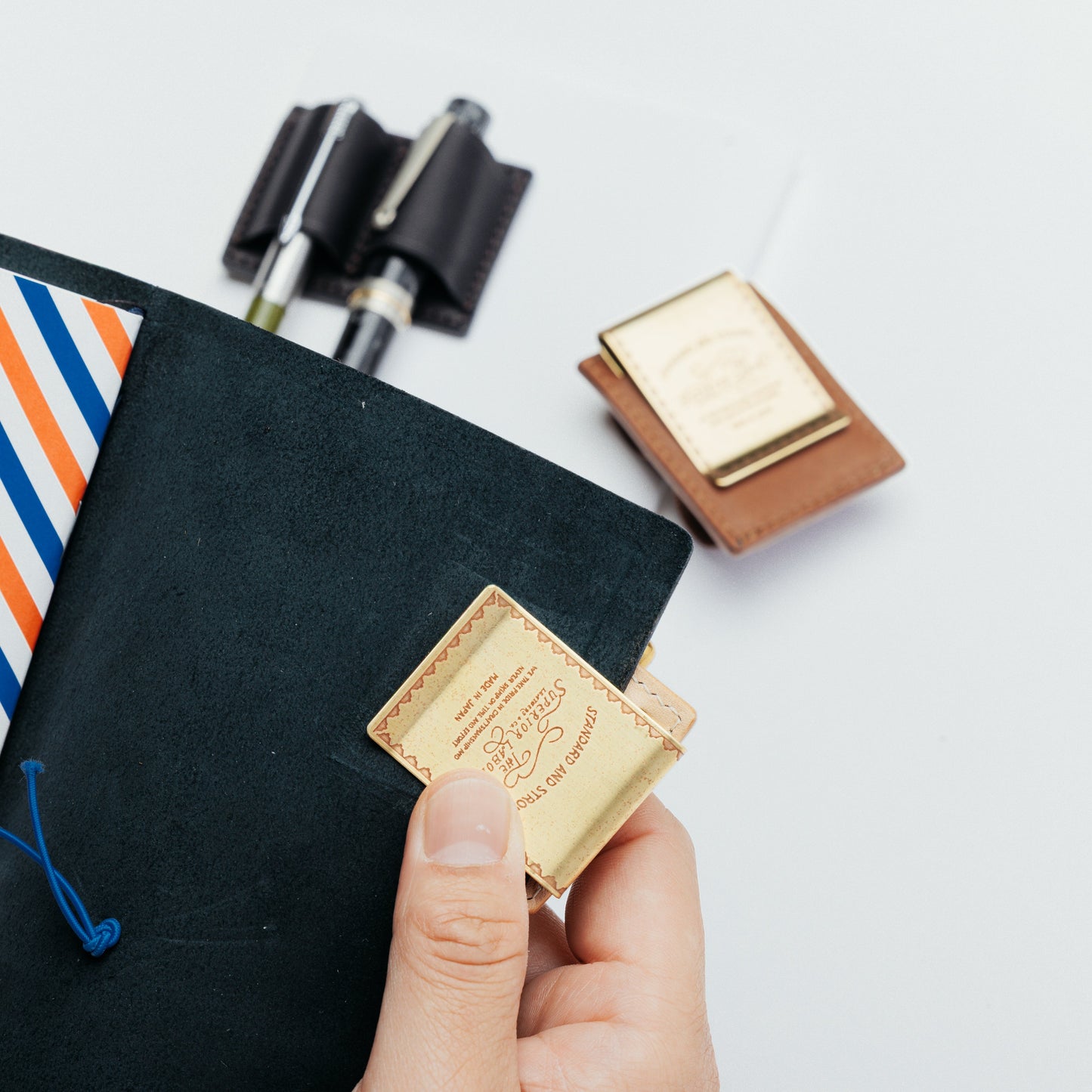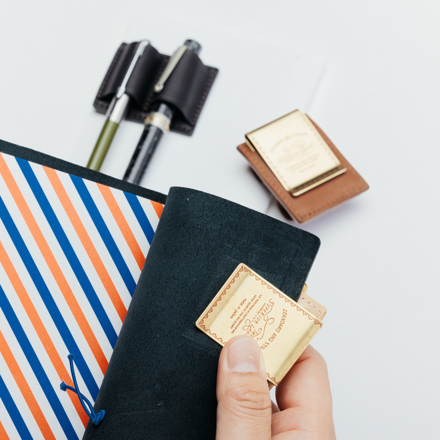 This pen holder clips onto the cover of your notebook or planner using the brass clip on the back. The clip is made from solid brass.