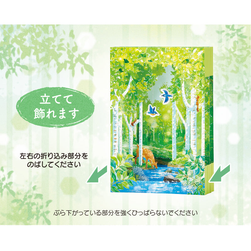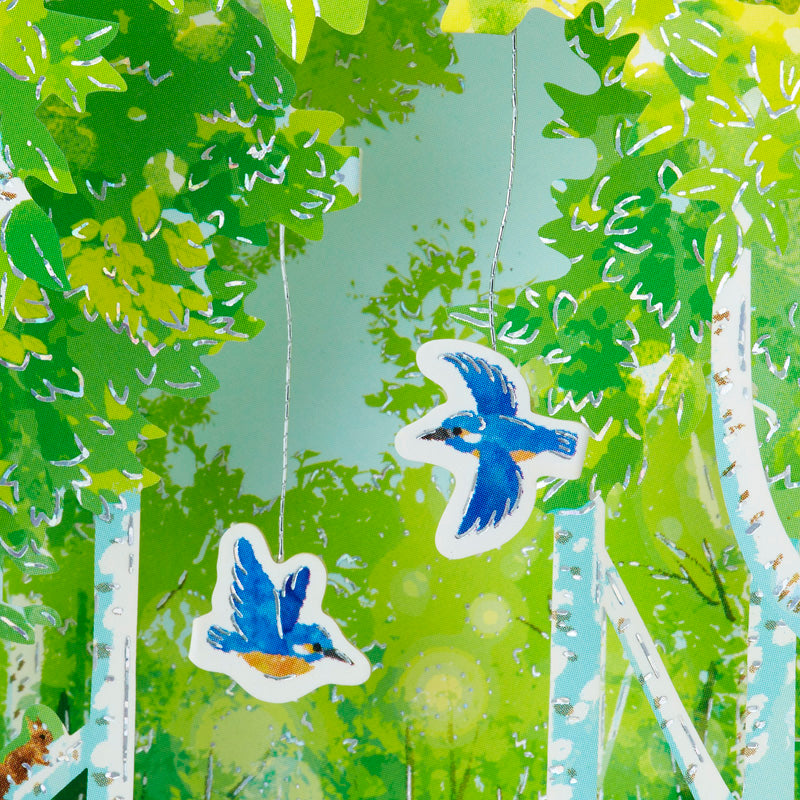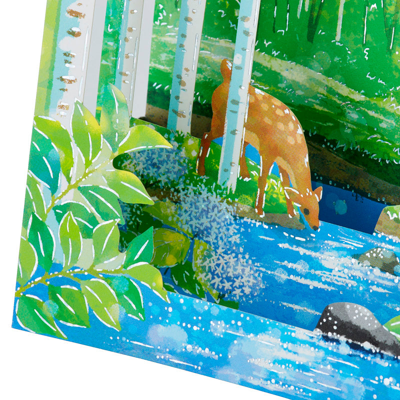 This is a beautiful 3D die-cut card depicting a "fresh greenery" that will make you want to take a deep breath, looking at such fresh young leaves, pleasant sunlight filtering through the trees, and the sparkling surface of the water. And do not miss the two blue birds suspended by a silver thread that sway back and forth, the lovely deer and the playful squirrels.