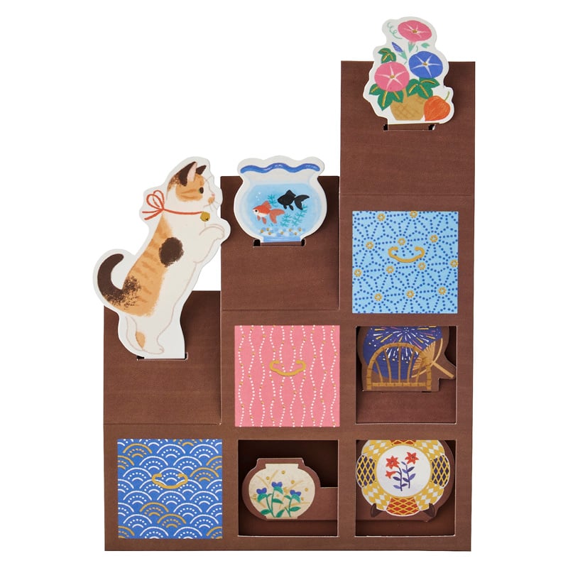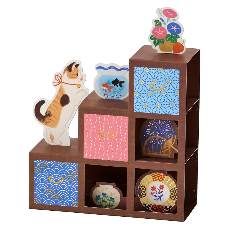 A tender scene of tranquil curiosity—this beautifully layered 3D die-cut card showcases a traditional Japanese kaidan tansu (staircase chest), adorned with patterned drawers, vintage ornaments, and the gentle gaze of a cat entranced by a tiny goldfish bowl, together with "asagao" flowers (Morning Glory), the main character of summer days!
