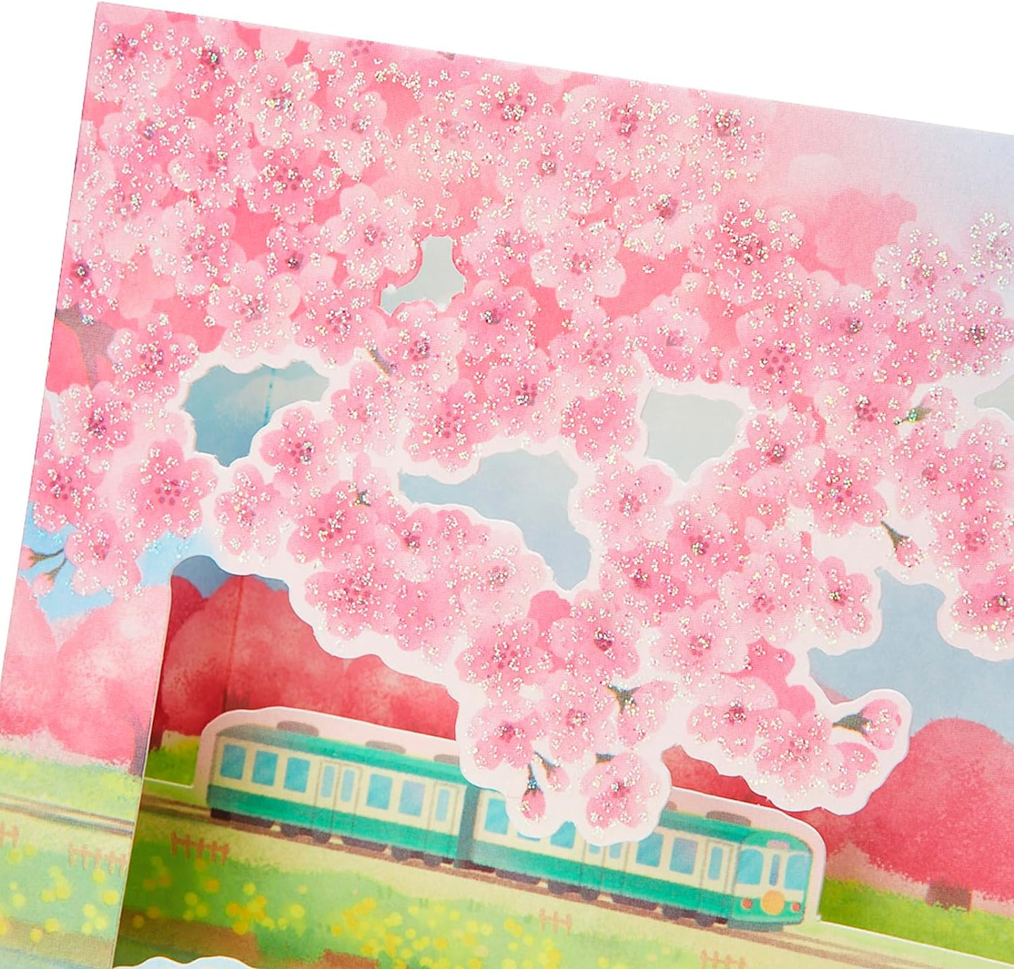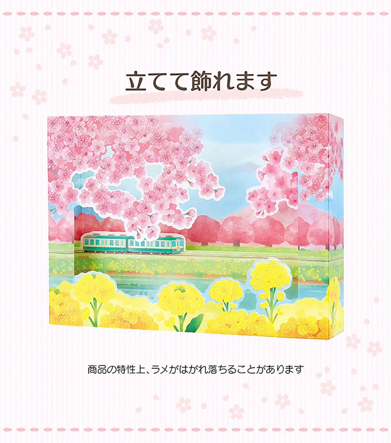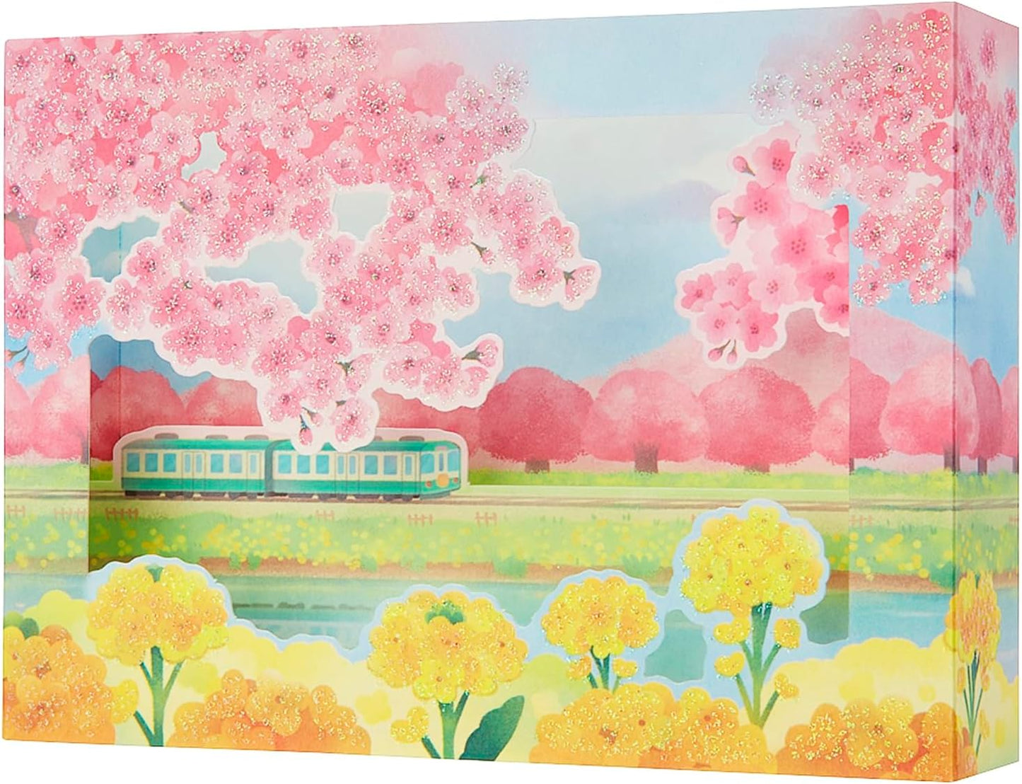 - A 3D card shows the scenery of a train running through cherry blossoms and yellow flowers