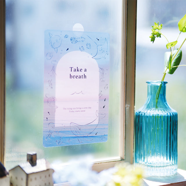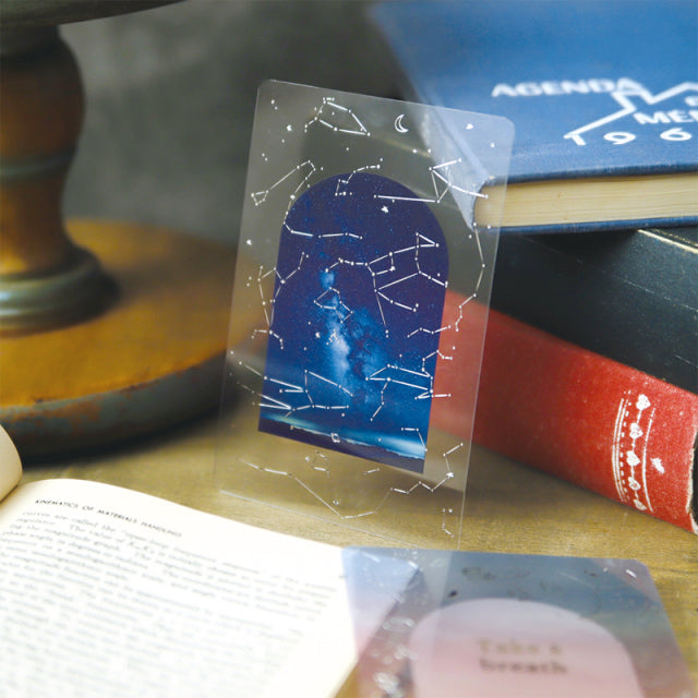 These cards are made from thick clear material, with vibrant printing and silver foil all over, giving them an attractive transparency and glossiness. When displayed as interior décor on a window, wall, or desk, the foil stamping sparkles and changes appearance depending on the angle and the way the light hits it.